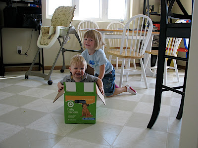 This morning made me question again why we bother spending money on toys. Alison and Eli spent quite a while this morning playing with an empty diaper box. After a while, Jennifer put Eli in the box and he just sat there with a big grin. It didn't take long and Alison started to push the box making train noises. They made a few passes through the kitchen, laughing all the way.